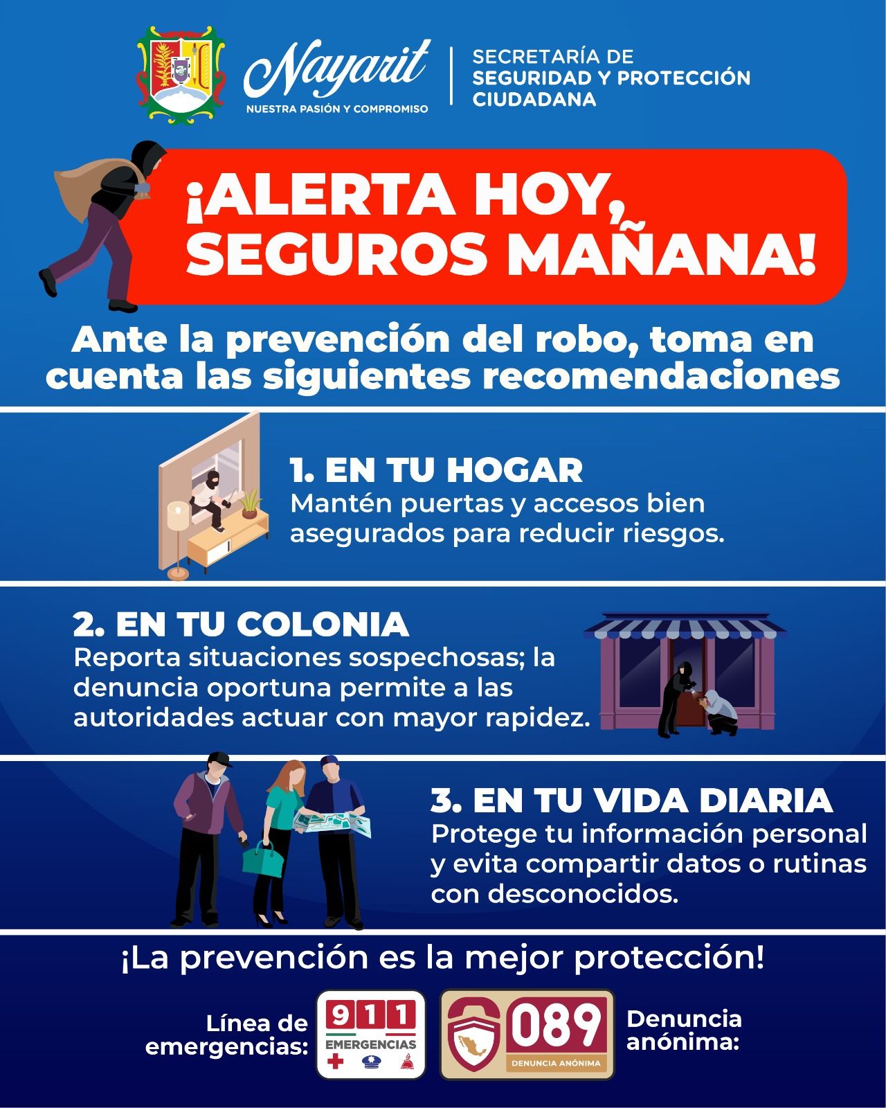 Para prevenir robos: asegura puertas y accesos en tu hogar, reporta situaciones sospechosas en tu colonia y protege tu información personal.