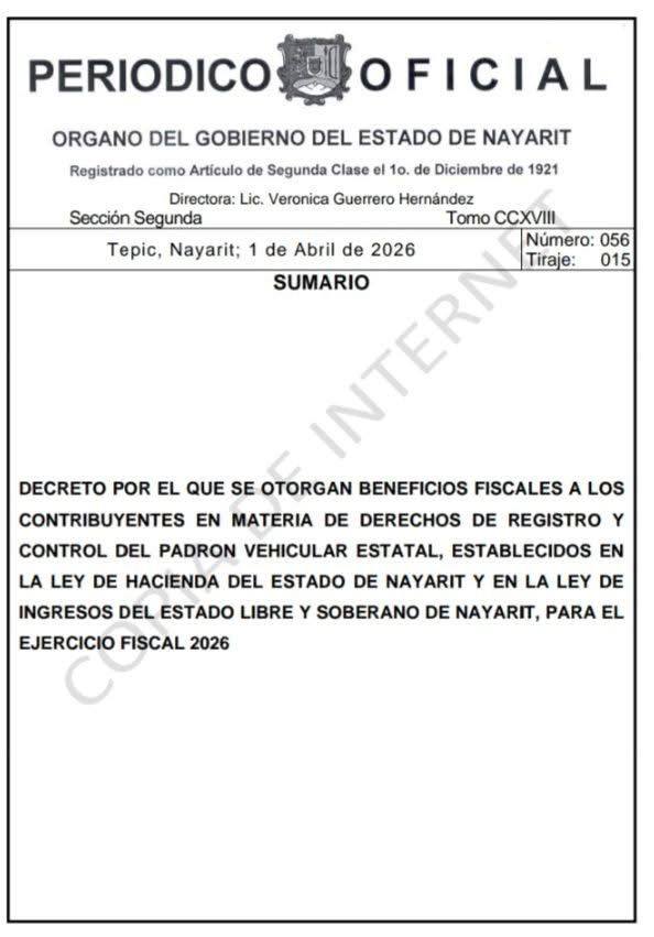 De acuerdo con el decreto publicado en el Periódico Oficial y por instrucciones del gobernador del estado, Miguel Ángel Navarro Quintero, se amplía hasta el 30 de junio el plazo para acceder al 15 por ciento de descuento en trámites vehiculares, como el pago de placas, tarjeta de circulación y verificación.