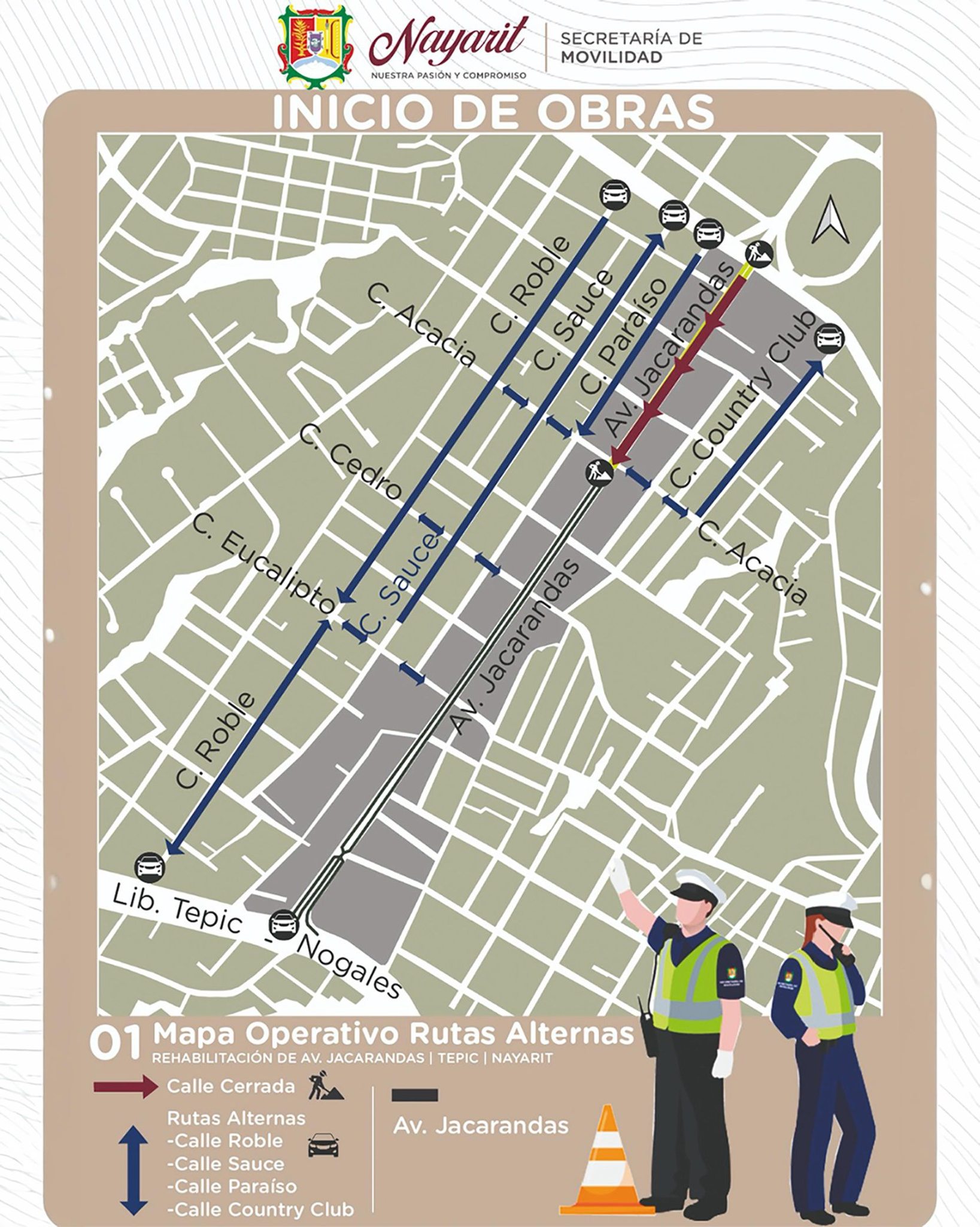 El Gobierno del Estado de Nayarit, a través de la Secretaría de Movilidad, informa que la avenida Jacarandas, en Tepic, presenta cierres temporales debido a los trabajos de renovación que se realizan en esta vialidad.