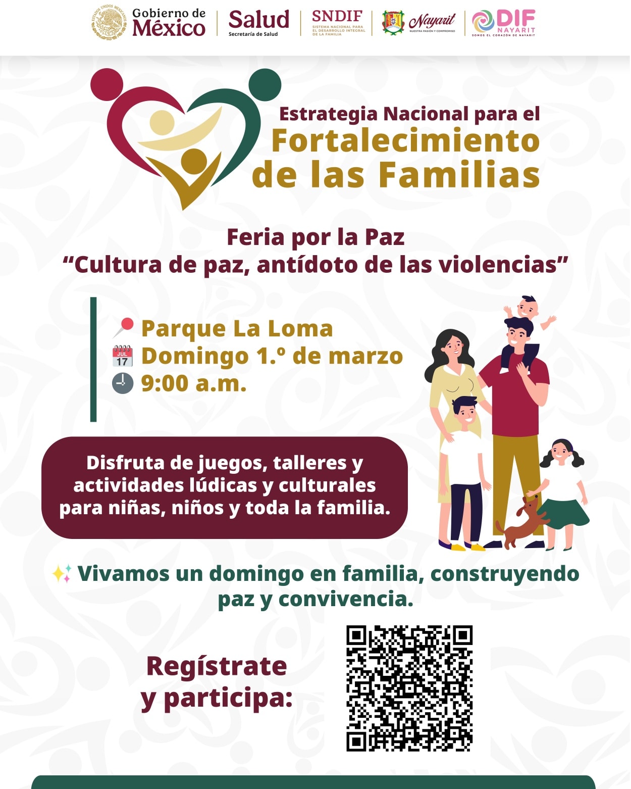 El Corazón de Nayarit te invita a ser parte de la Feria por la Paz “Cultura de paz, antídoto de las violencias”, un espacio pensado para niñas, niños y familias, con actividades recreativas y culturales que promueven la sana convivencia, el respeto y la armonía.