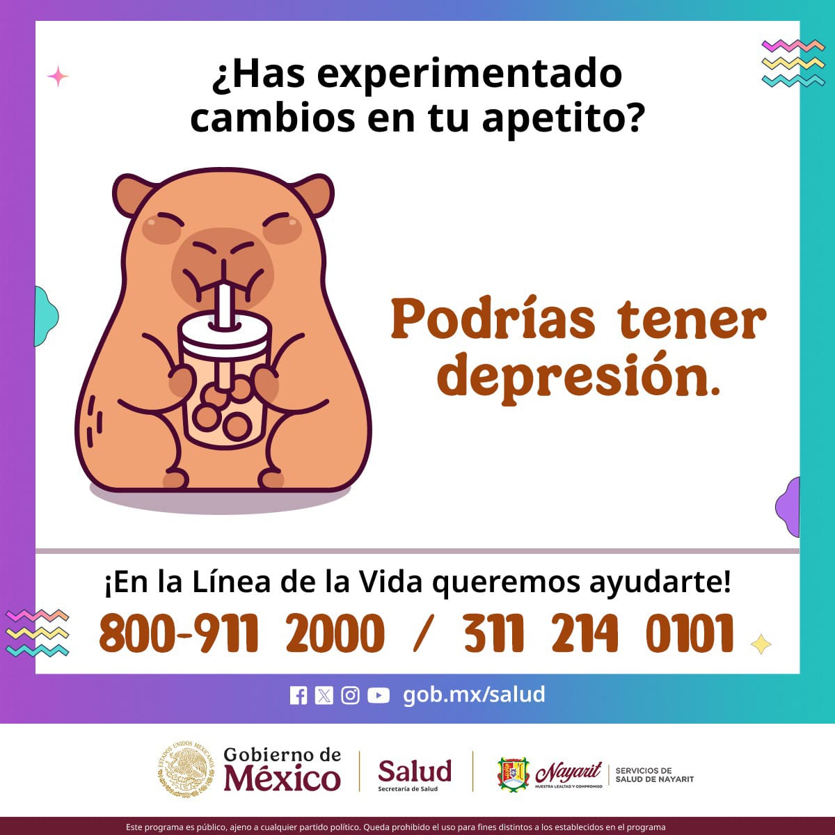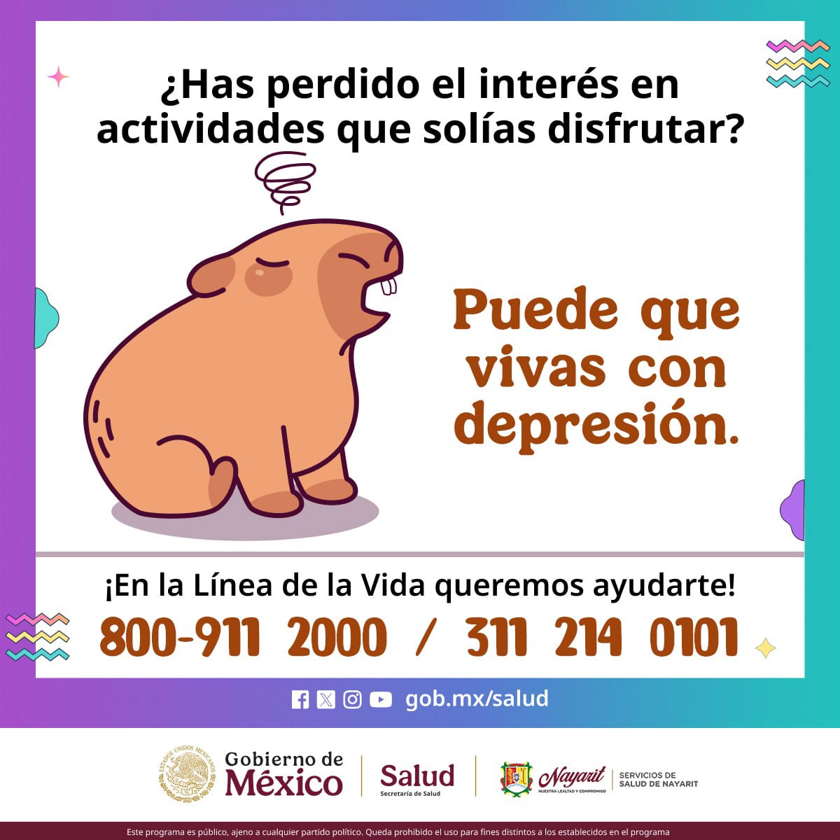 En Nayarit, la depresión es el primer motivo por el cual se atiende un paciente en consultorios de atención psicológica, seguido por ansiedad, los trastornos de conducta y los asociados al uso de sustancias psicoactivas o alcohol. Los Servicios de Salud de Nayarit ponen a disposición de la población la línea de atención psicológica 311 214010 con servicio las 24 horas.