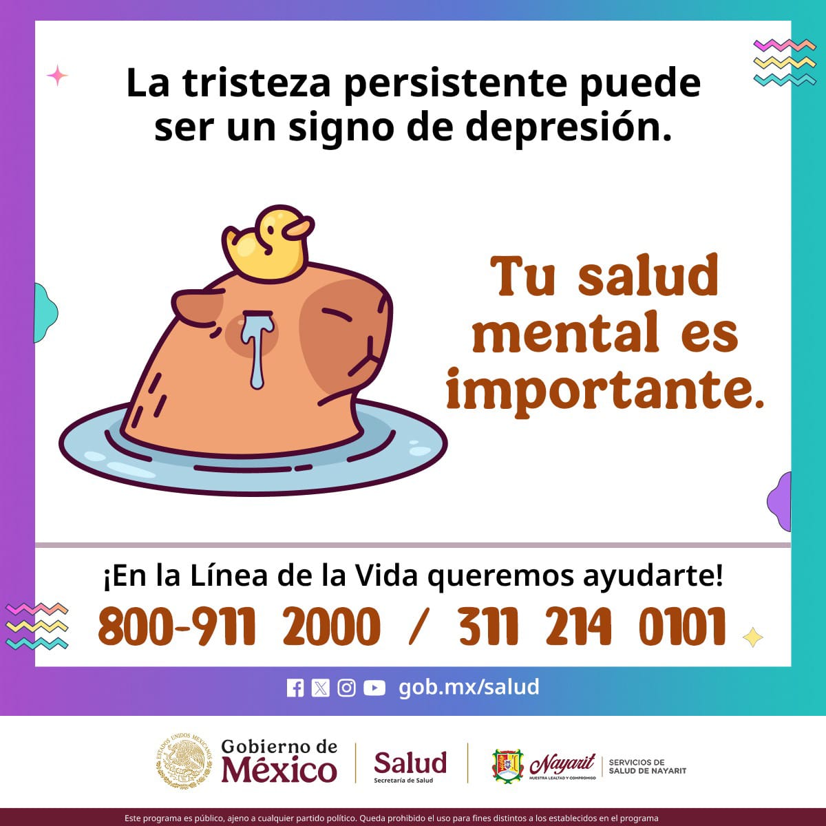 En Nayarit, la depresión es el primer motivo por el cual se atiende un paciente en consultorios de atención psicológica, seguido por ansiedad, los trastornos de conducta y los asociados al uso de sustancias psicoactivas o alcohol. Los Servicios de Salud de Nayarit ponen a disposición de la población la línea de atención psicológica 311 214010 con servicio las 24 horas.