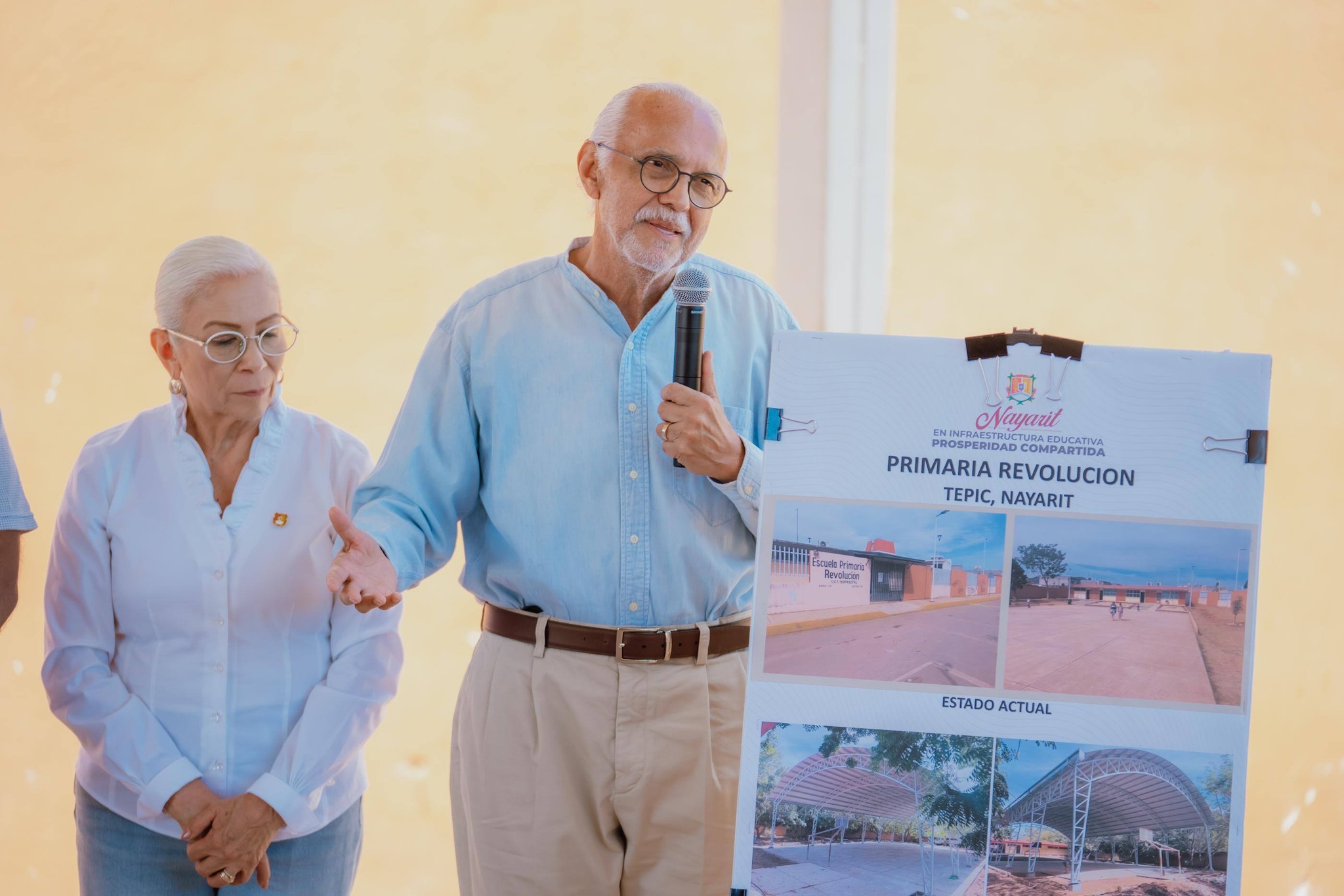 En la primaria Revolución, en Tepic, acompañado de su esposa, la doctora Beatriz Estrada Martínez, presidenta del Sistema DIF Nayarit, dio inicio a la construcción de un domo y una cancha de usos múltiples, además de acordar acciones para fortalecer el plantel con el equipamiento de su cocina, una bodega para alimentos, aire acondicionado, material deportivo y un proyector.