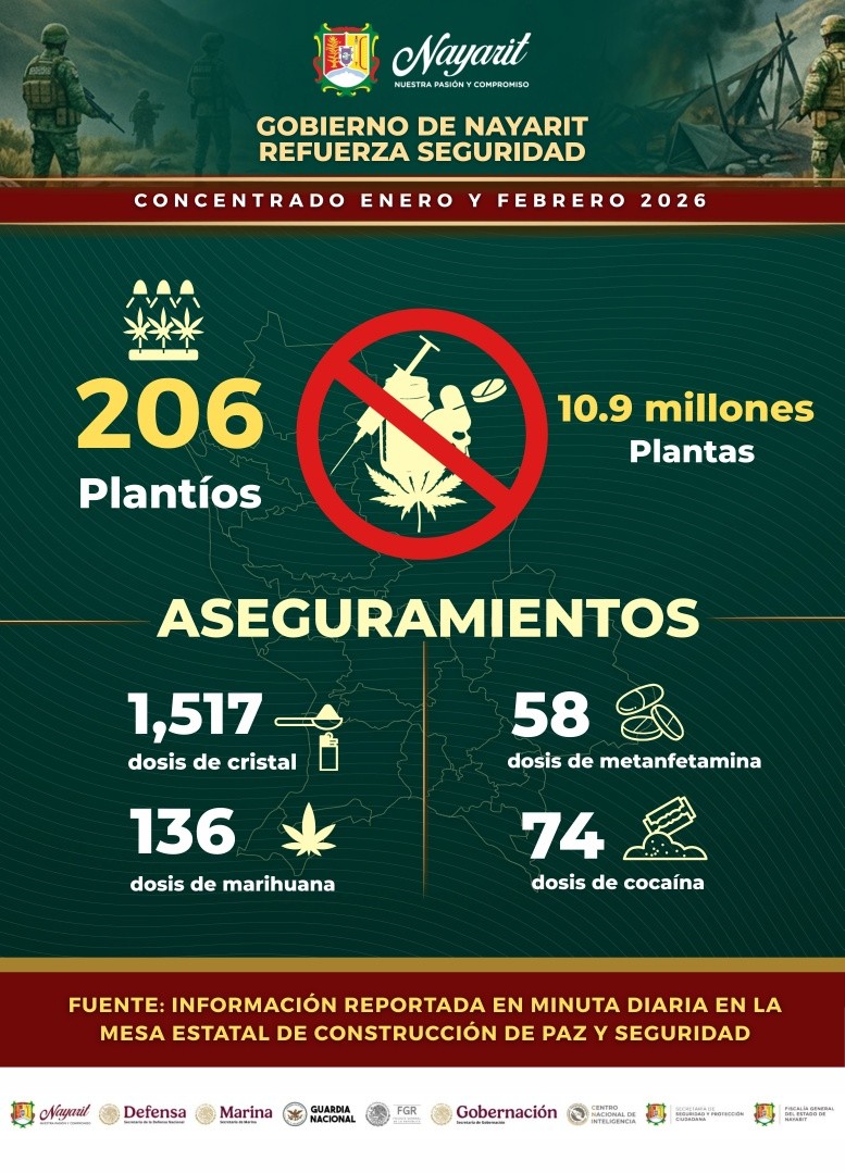 Señaló que, durante enero y febrero, se aseguraron armas, municiones, vehículos y artefactos que representaban un riesgo para la población; también se retiraron de circulación sustancias que afectan a las juventudes y se destruyeron plantíos ilícitos que dañan el tejido social. Enfatizó que detrás de cada cifra hay trabajo operativo, coordinación institucional y decisiones orientadas a cuidar la vida y preservar la paz.