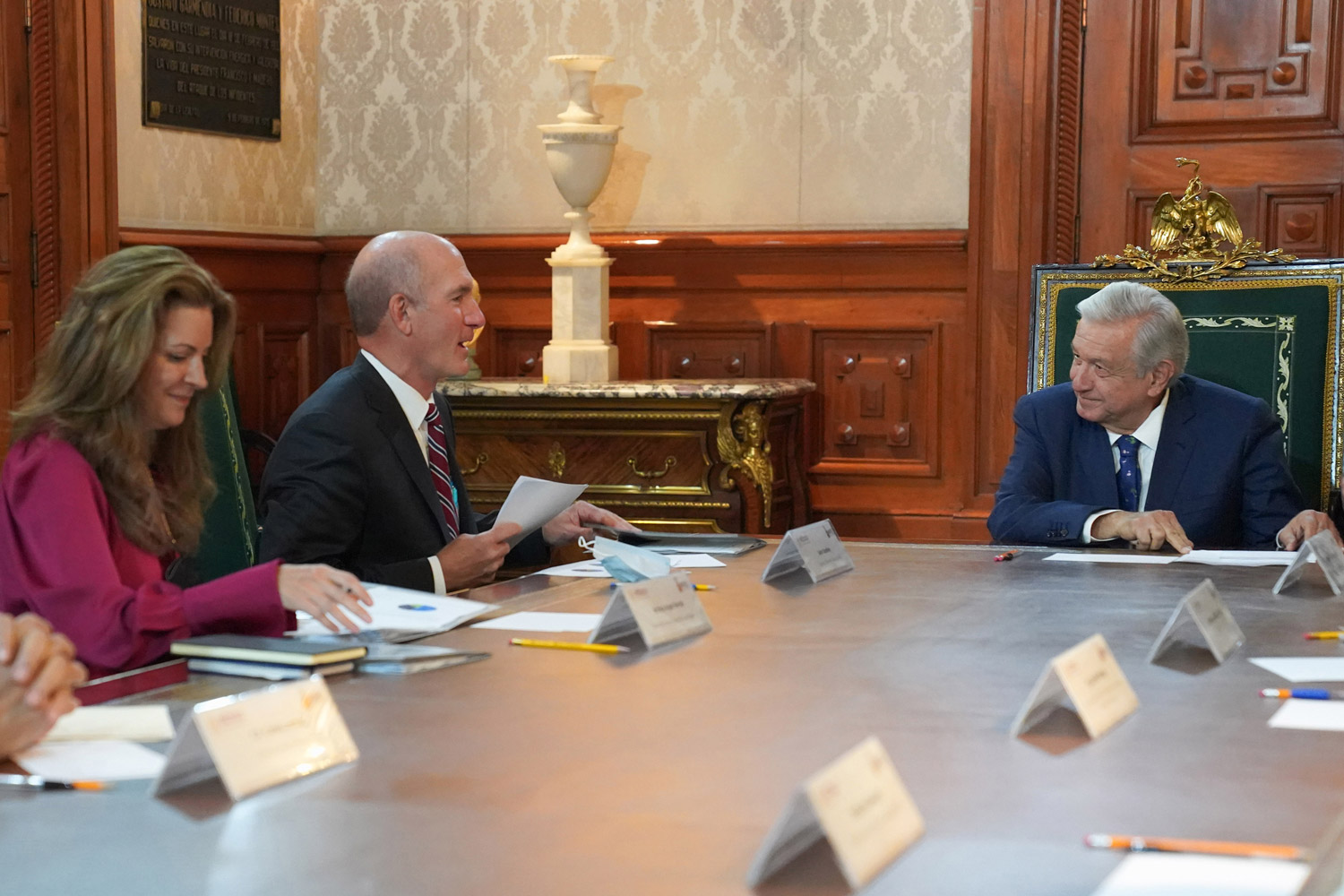 El presidente Andrés Manuel López Obrador sostuvo este jueves una reunión en Palacio Nacional con el director general global de AT&T, John Stankey y la directora general en México, Mónica Aspe Bernal.