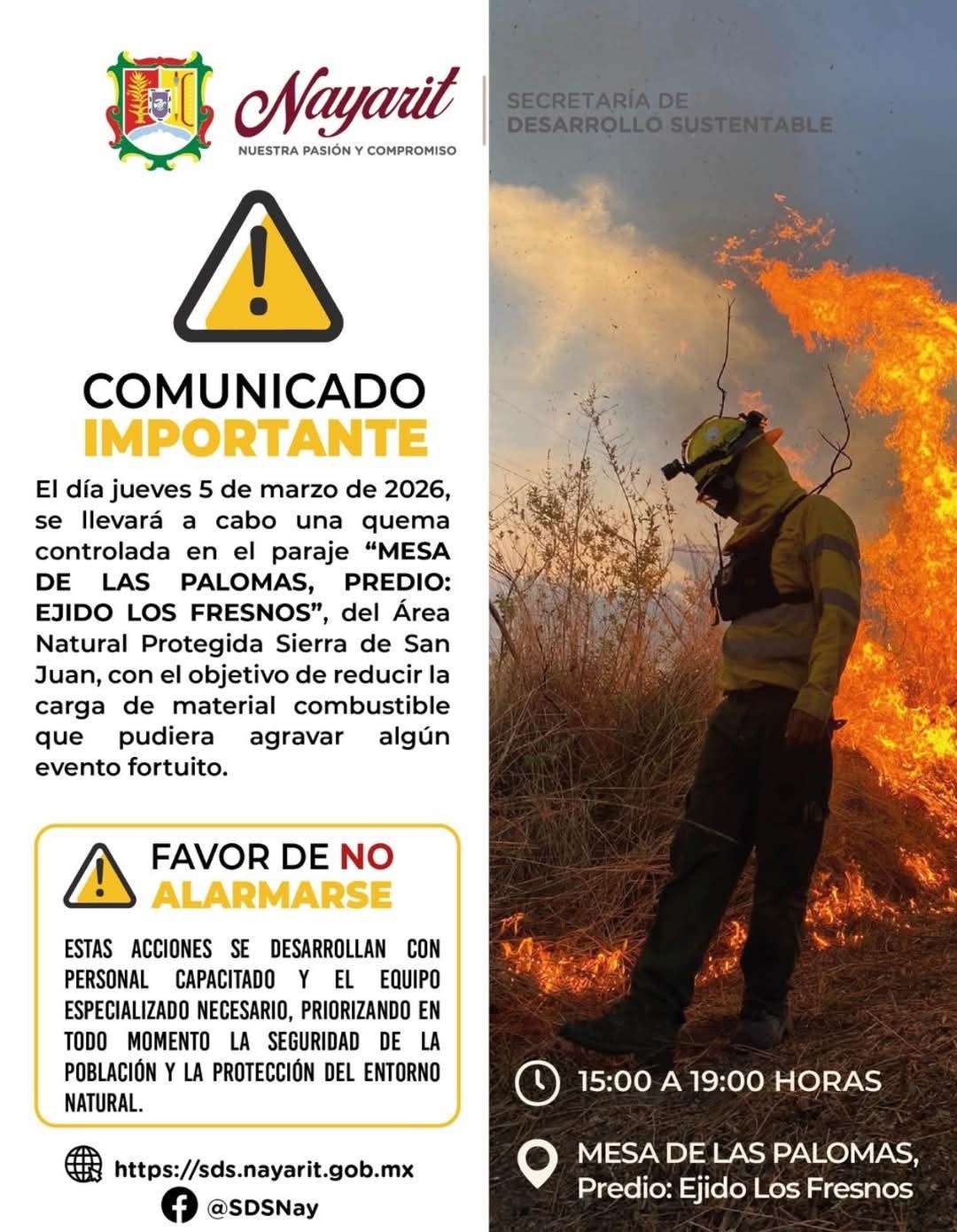 El Gobierno del Estado de Nayarit, a través de la Secretaría de Desarrollo Sustentable, informa que en estos momentos se realiza una quema prescrita controlada en el paraje Mesa de Las Palomas, en el ejido Los Fresnos, en Tepic.