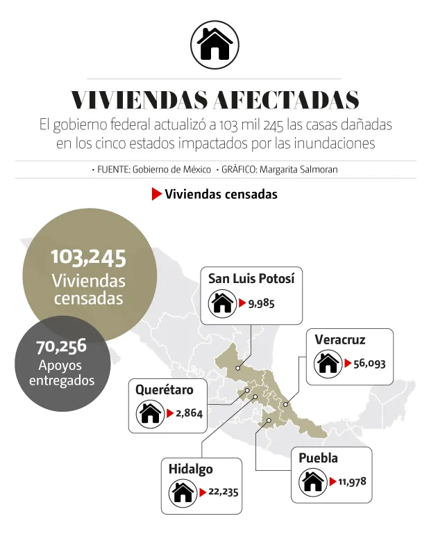 Montiel Reyes agregó que los servidores de la nación han censado 103 mil 245 viviendas en 119 municipios de los estados afectados por las lluvias: 56 mil 93 en Veracruz, 22 mil 325 en Hidalgo, 11 mil 978 en Puebla, nueve mil 985 en San Luis Potosí y dos mil 864 en Querétaro.