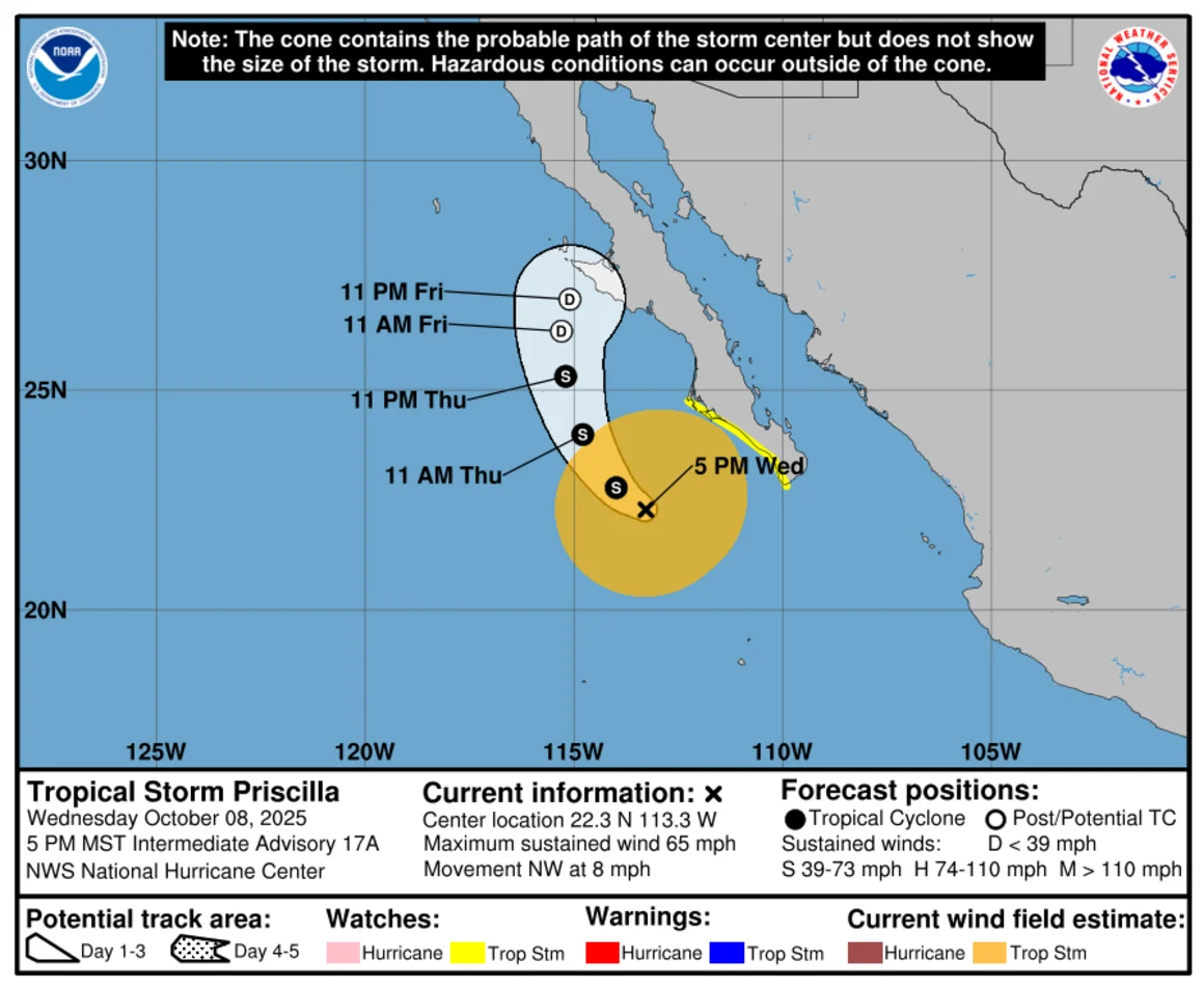 El NHC avisa que a medida que Priscilla se mueve fuera de la costa oeste de Baja California, podrían llegar a caer hasta alrededor de 3 centímetros de lluvia a través de la península de Baja California.