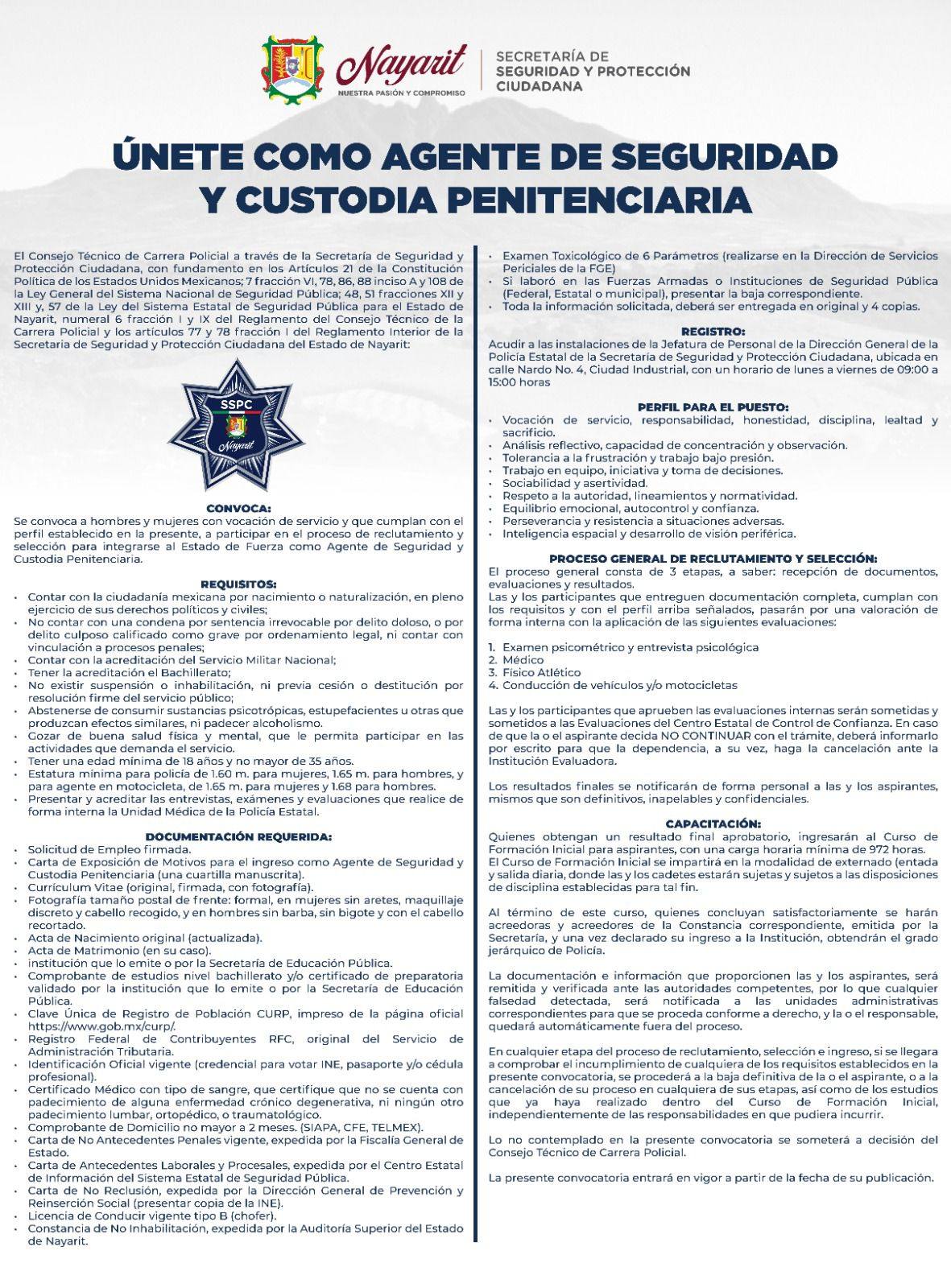 El Gobierno del Estado de Nayarit, a través de la Secretaría de Seguridad y Protección Ciudadana, te invita a formar parte del proceso de reclutamiento para ser Agente de Seguridad y Custodia Penitenciaria.